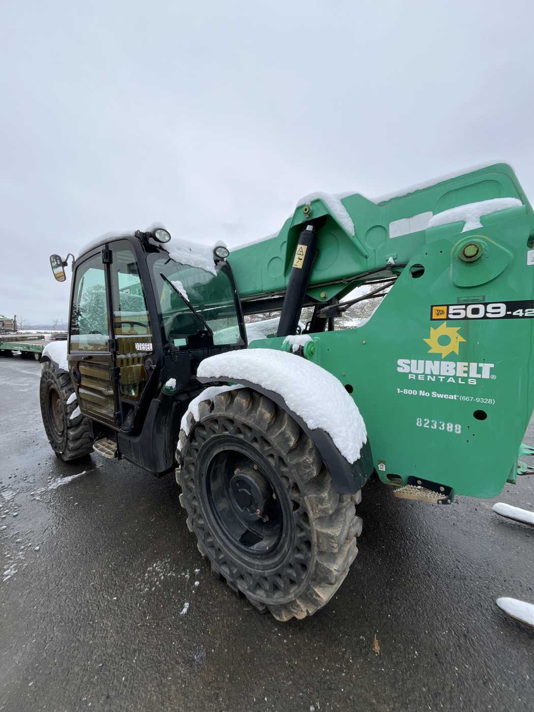 This 2016 JCB 509-42 telehandler offers a 42′ reach and 9,000 lbs lifting capacity with 4WD for steady performance on rough terrain. With 3,720 hours, it is rental-ready and powered by a diesel engine. The enclosed heated cab improves cold-weather operation, while solid tires prevent downtime from flats. Crab steering, frame leveling, and auxiliary hydraulics allow precise machine positioning, controlled load placement, and quick attachment changes for efficient material handling on active job sites.